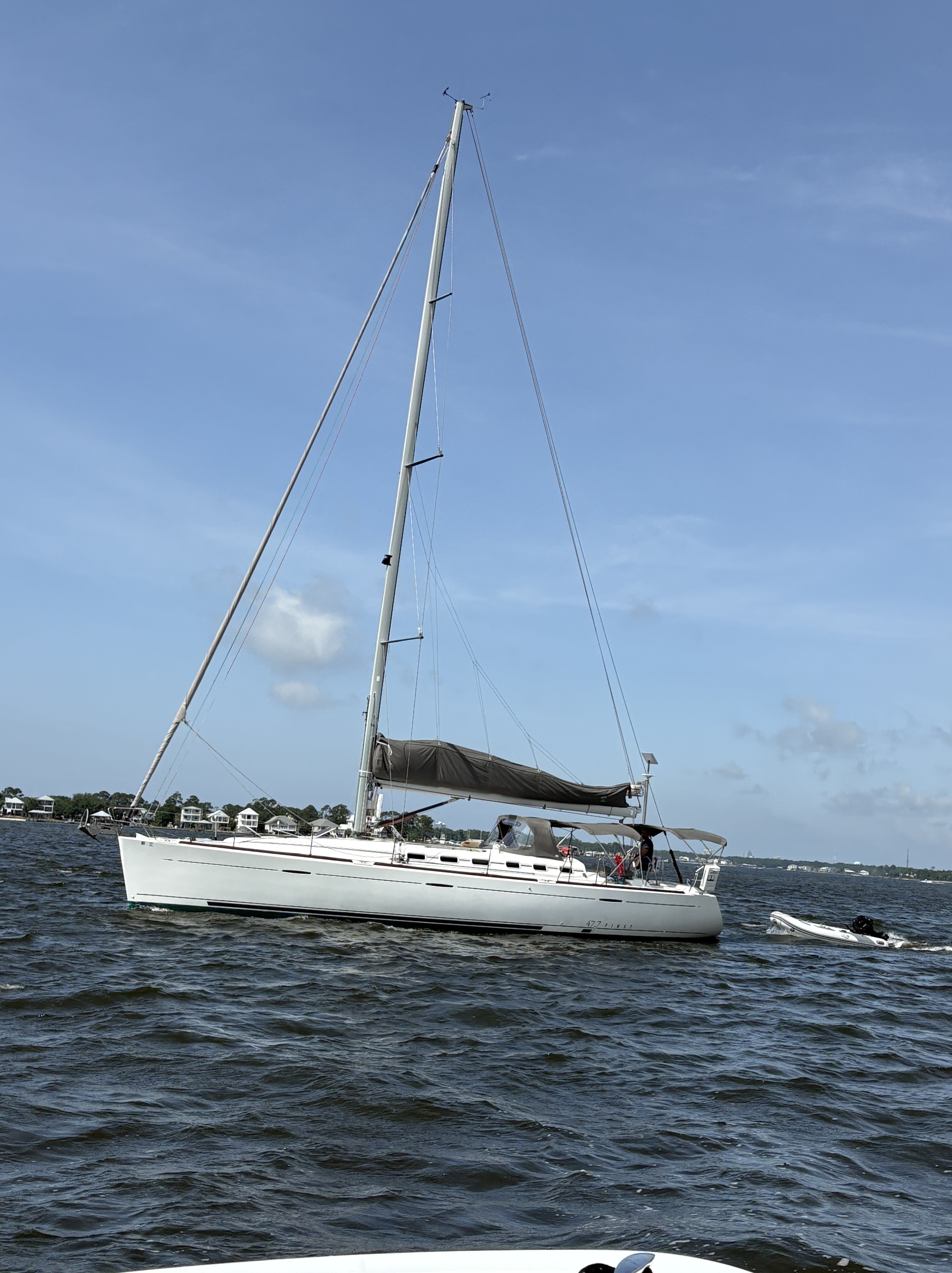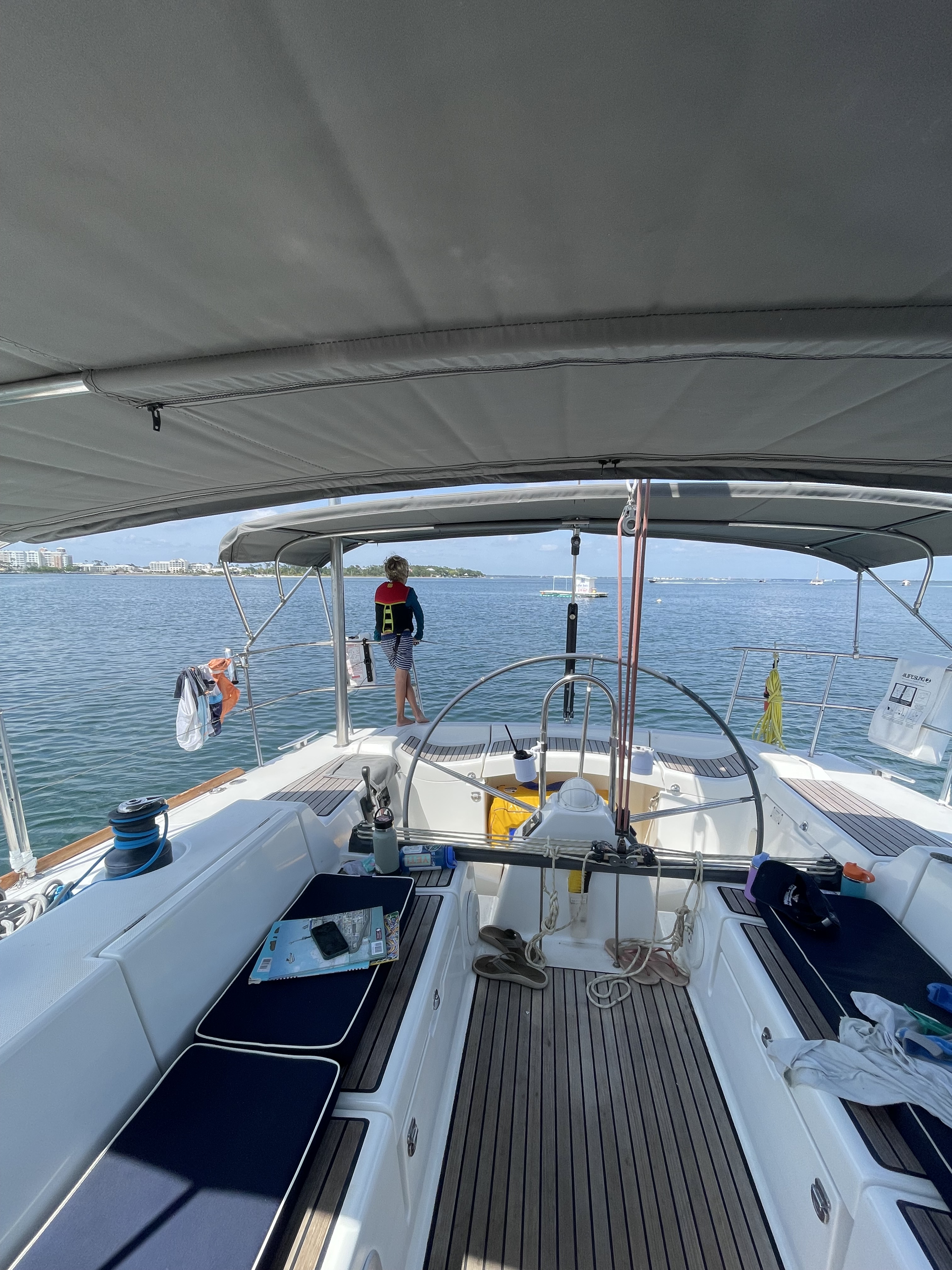 Just one night in Pensacola, where we replaced the jib roller – the last repair from damage done on the passage, then it was on to Destin for a night. We were finally able to put the sails up for a part of the trip there. It was everyone but Barrett’s first real experience offshore, and the boys both had funny tummies. A little bout with seasickness followed by lots of rest time, but everyone was OK at the end of the trip. Destin Harbor was busy and loud during the day, but quiet and lovely during the night. Entering the channel there was our first sight of clear, turquoise water. The kids noticed, and one said, “This is the most beautiful water I’ve seen!” The entrance to the harbor has some serious shallows and shoaling, but it all turned out well coming and going.