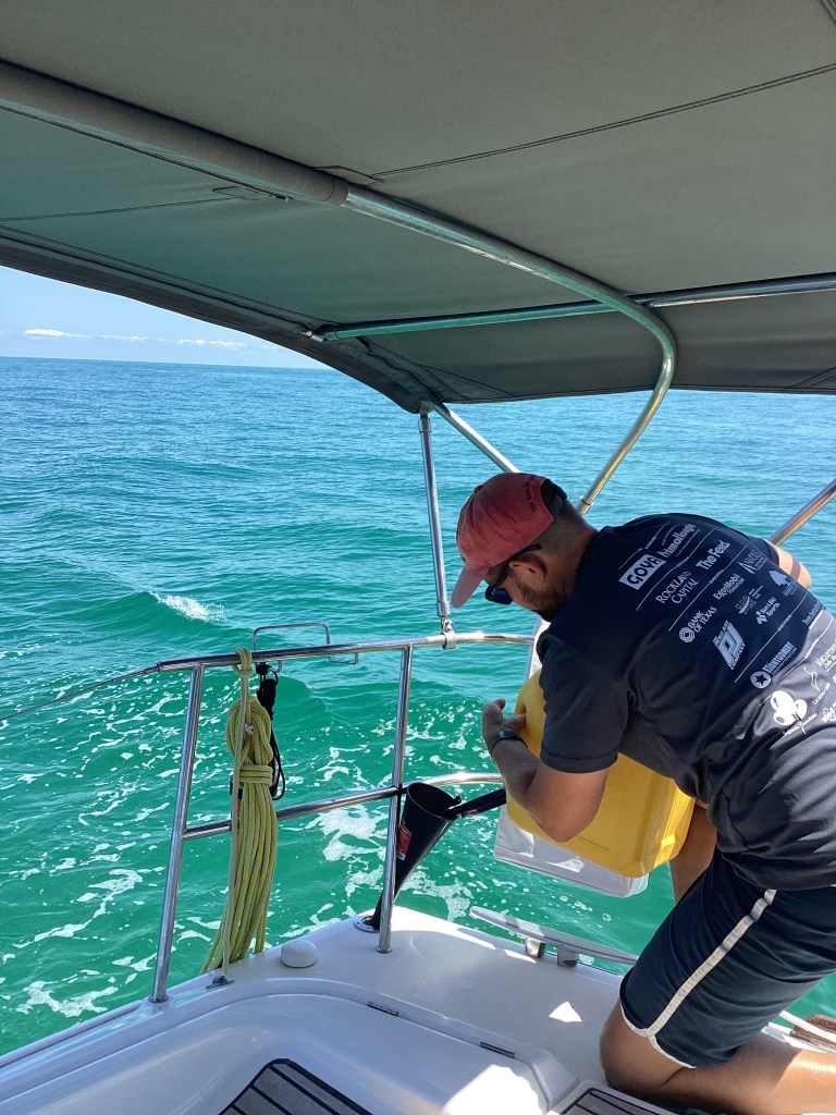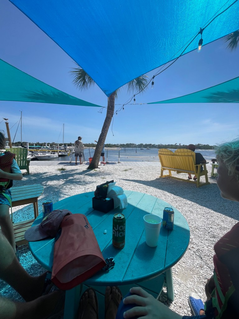 Turns out the Clearwater marina was closed due to lingering repairs from last year’s hurricanes, and one in Tarpon Springs was closed due to present power outages, we called the Anclote Village Marina. Barrett learned we wouldn’t be able to fit in the marina, but we could anchor three miles away and dinghy in for a fuel refill. So he emptied our onboard diesel cans to be ready upon arrival while we dodged crab traps and fought the current coming into the anchorage.